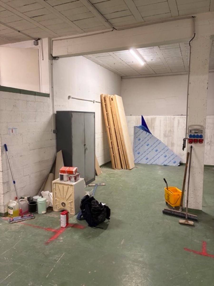 I’m renting a 20m2 space in an open plan warehouse and building a new, one-room writing/mixing studio (I make production music for a living). My neighbours in adjoining spaces are artists/artisans of various persuasions. Some of them would probably be bothered by drums/amps and some will make similar levels of noise themselves. My space is in the corner of the basement. The existing walls are made of mixed materials, some parts concrete, some brick, some plasterboard stud wall (in the sketchup drawing below you can see plasterboard marked in beige and concrete/brick in orange). The floor is concrete and the ceiling looks to me like concrete joists with smaller concrete blocks laid between them (I don’t know what this is called, I’ll share a photo below). The ceiling height is 3.7 metres and my floor area is roughly 5.6*3.3 metres. My plan is to build a standard two leaf system. I have a limited budget to devote to this as the lease is limited to three years, after which the space will get torn down, so I’m hoping to do the minimum necessary to achieve the isolation I want. I'm hoping two layers of air-tight 13mm plasterboard with reinforced stock "acoustic" doors and baffled air inlets/outlets will get me there.