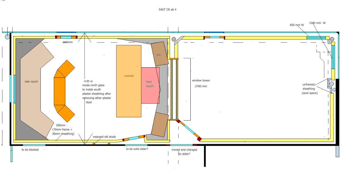 For this and other reasons, my preferred option is still the wide room (north facing). Either way, the new guy advises that I should still put a 60mm high floating floor in the CR and suspend an RC ceiling taking up 80mm space. He claims any resonance is soaked up by the 60kg/m3 insulation. BTW, he has since confessed that the fibre wood (canite) part of the sandwich doesn't get used any more as he's never been convinced it is worth the expense or the 13mm space. He's not a fan of the "inside out" module, not just because of extra materials and expense, but more so because he feels 450mm centres (not 600) is a critical part of his stiffness-centric approach...