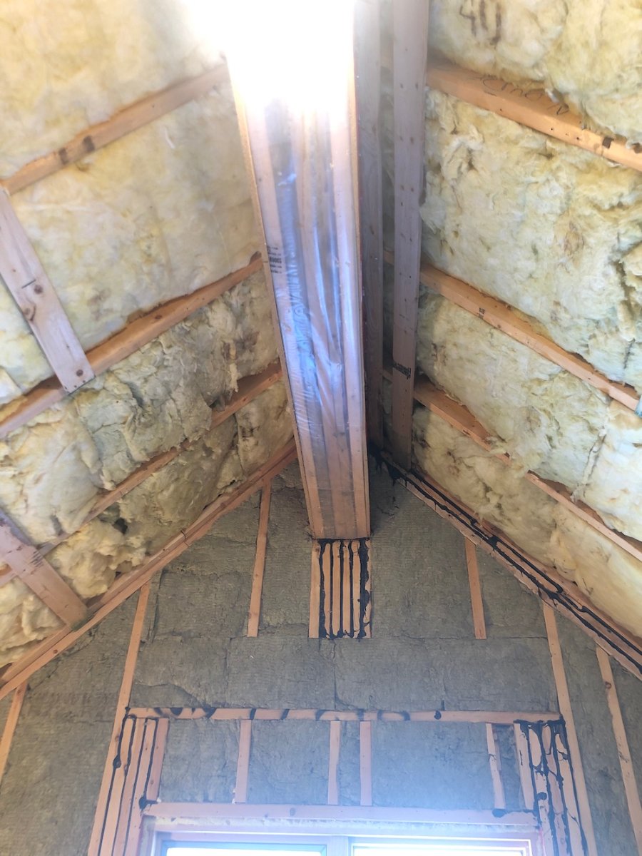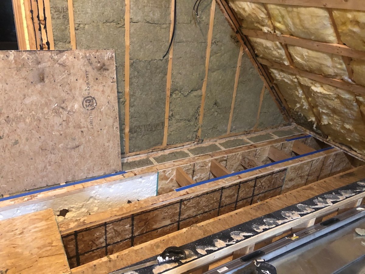 Now that the box is sitting at the top, I tried my best to completely surround the box with insulation. I had to fill every little nook and cranny and make sure there's no air gaps anywhere. Lots more insulation will need to be done later on but for now I'm making sure I address all of these hard to reach places because once the ceilings are framed I will not be able to get to those places so it all had to be done now.