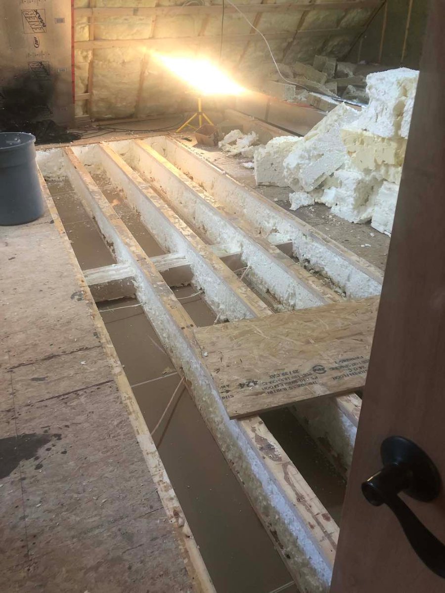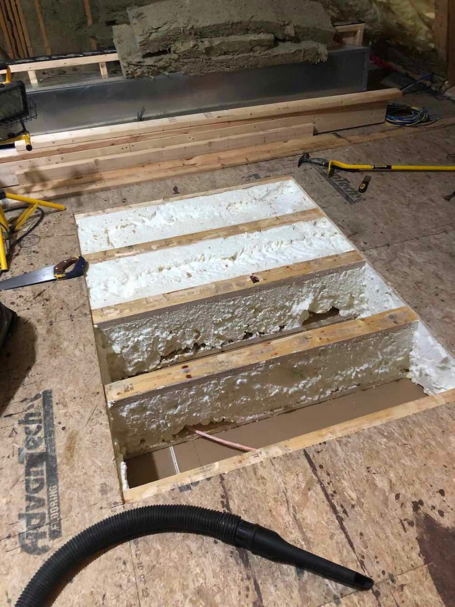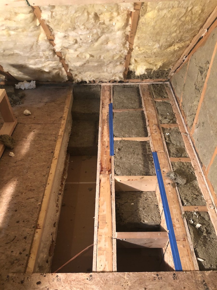 Here's the 2nd section of the floor where I had to rip out the existing sub-floor. I tell ya, must have filled around 35-40 garbage bags of spray foam insulation for the two sections combined. Doing this section was very similar to the first section so since I learned a few tricks from the previous section I was able to save a bit of time doing this one. Only difference this time is that I had to open it up a little wider to span across 3 floor joists versus 2 for the previous section. This section of the floor will support two separate inner leaf walls. 1 for the Control Room and the other for the Live Room. They will be approx. 14 inches apart.