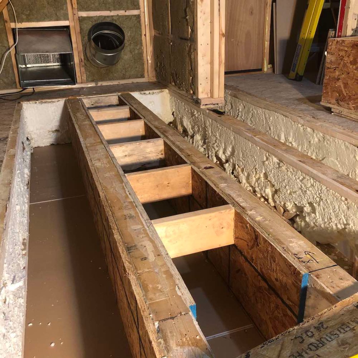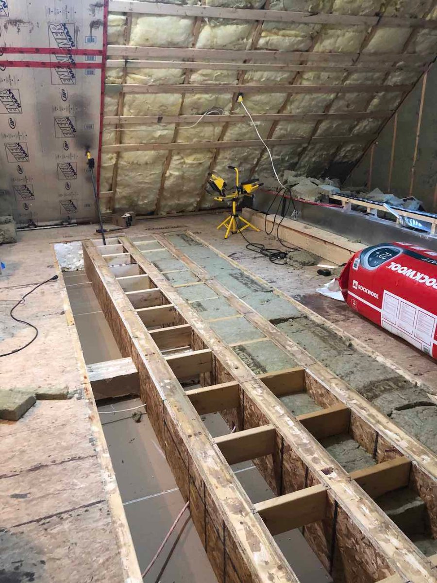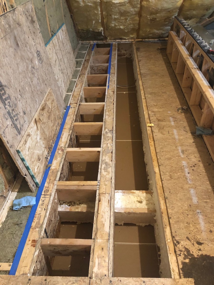 Here's the 2nd section of the floor where I had to rip out the existing sub-floor. I tell ya, must have filled around 35-40 garbage bags of spray foam insulation for the two sections combined. Doing this section was very similar to the first section so since I learned a few tricks from the previous section I was able to save a bit of time doing this one. Only difference this time is that I had to open it up a little wider to span across 3 floor joists versus 2 for the previous section. This section of the floor will support two separate inner leaf walls. 1 for the Control Room and the other for the Live Room. They will be approx. 14 inches apart.