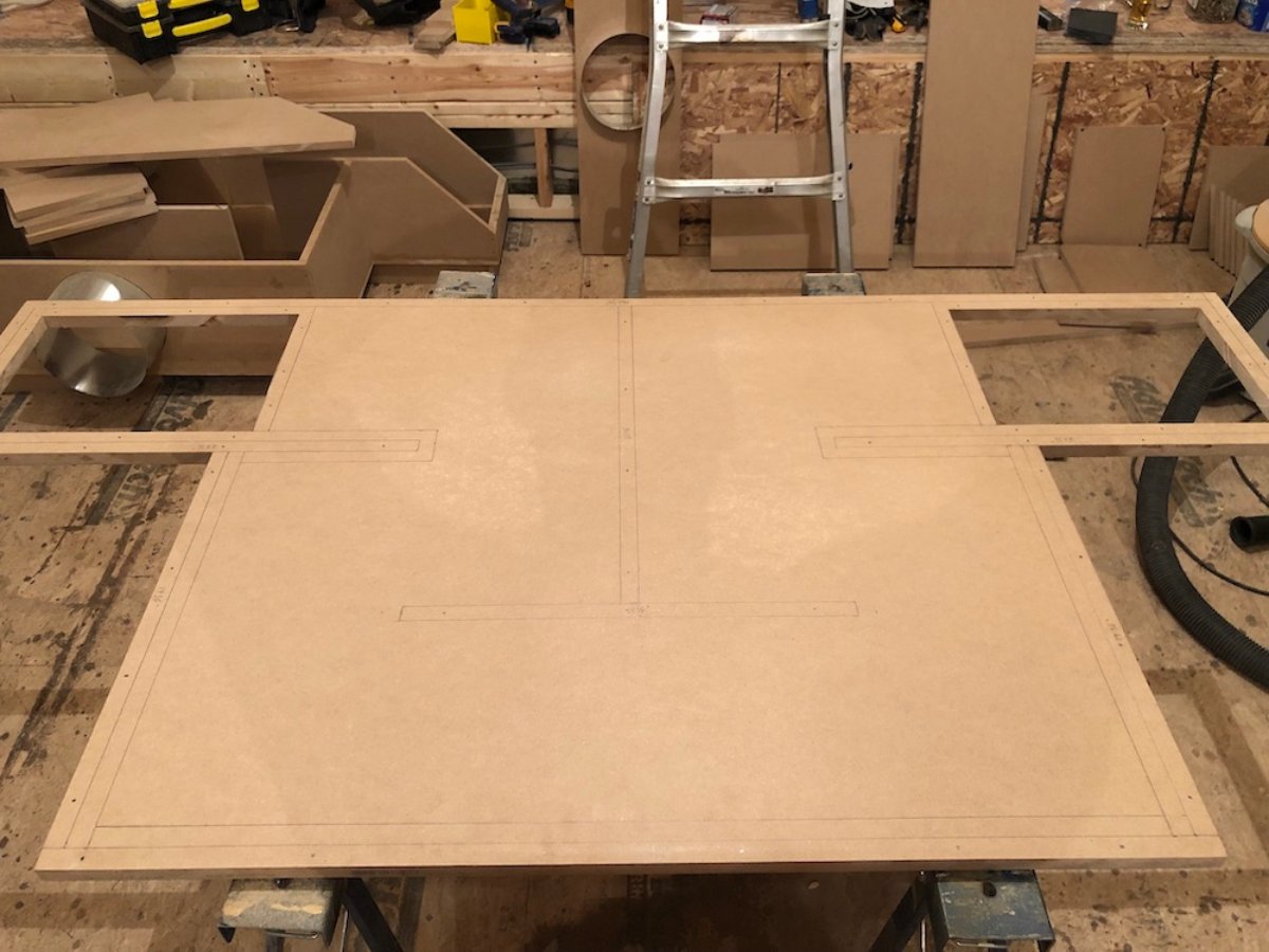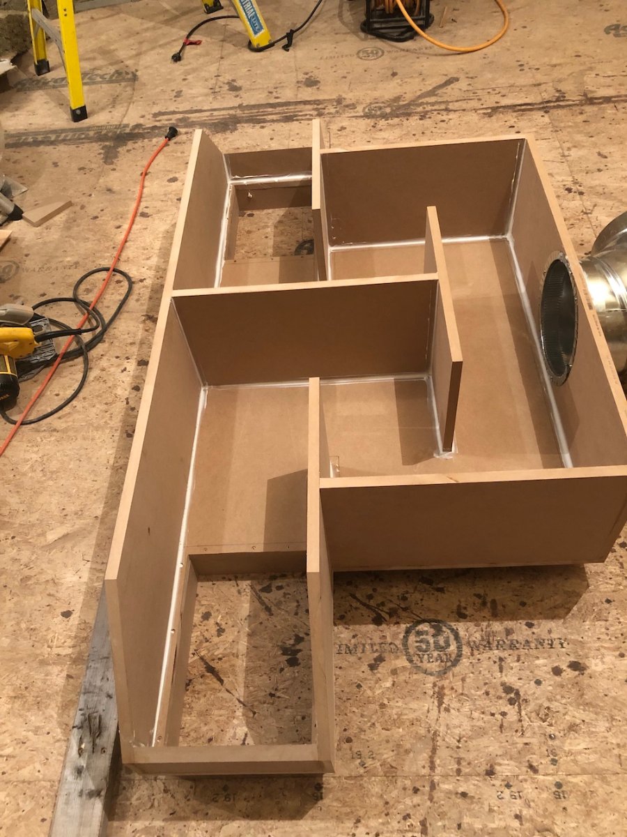 If you look at the 3D model sample of the studio in the previous post you'll see these big boxes sitting on top of my room ceilings. Those are the silencer boxes and you can also see, they take up a lot of room. They're HUGE!! To give you an idea, used almost 2x 4ft x 8ft sheets of 1 inch thick MDF to build each of these boxes and each sheet of MDF weighs roughly 120lbs. Add glue, sealant, duct liner, fasteners and I estimate each box to weigh around 250lbs if not more.