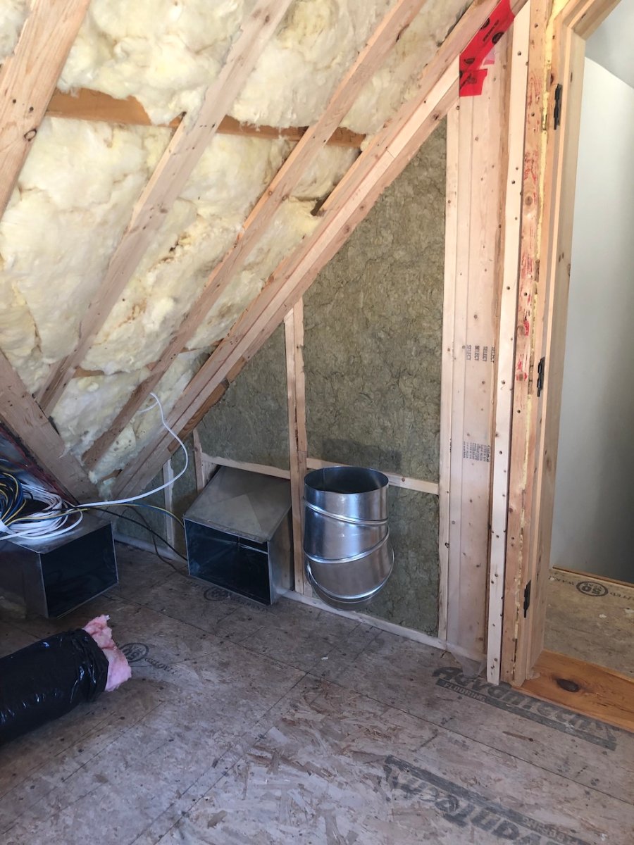 I also realize there's still a bit of work to be done to really seal off the duct work going through the wall. I made sure to leave about 1/4" 1/2" inch all around the square trunk to put some acoustical caulk of some type. The current leaf that you see for the HVAC closet is composed of 3/4" OSB, but might end up putting an additional layer of 5/8" drywall. I might even need to poke another hole or two for running additional ducts for the HRV unit.