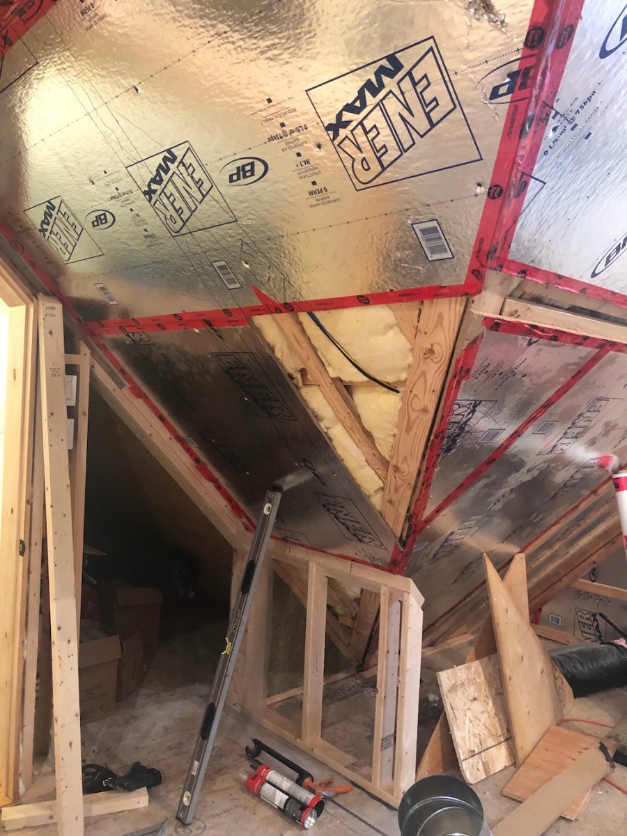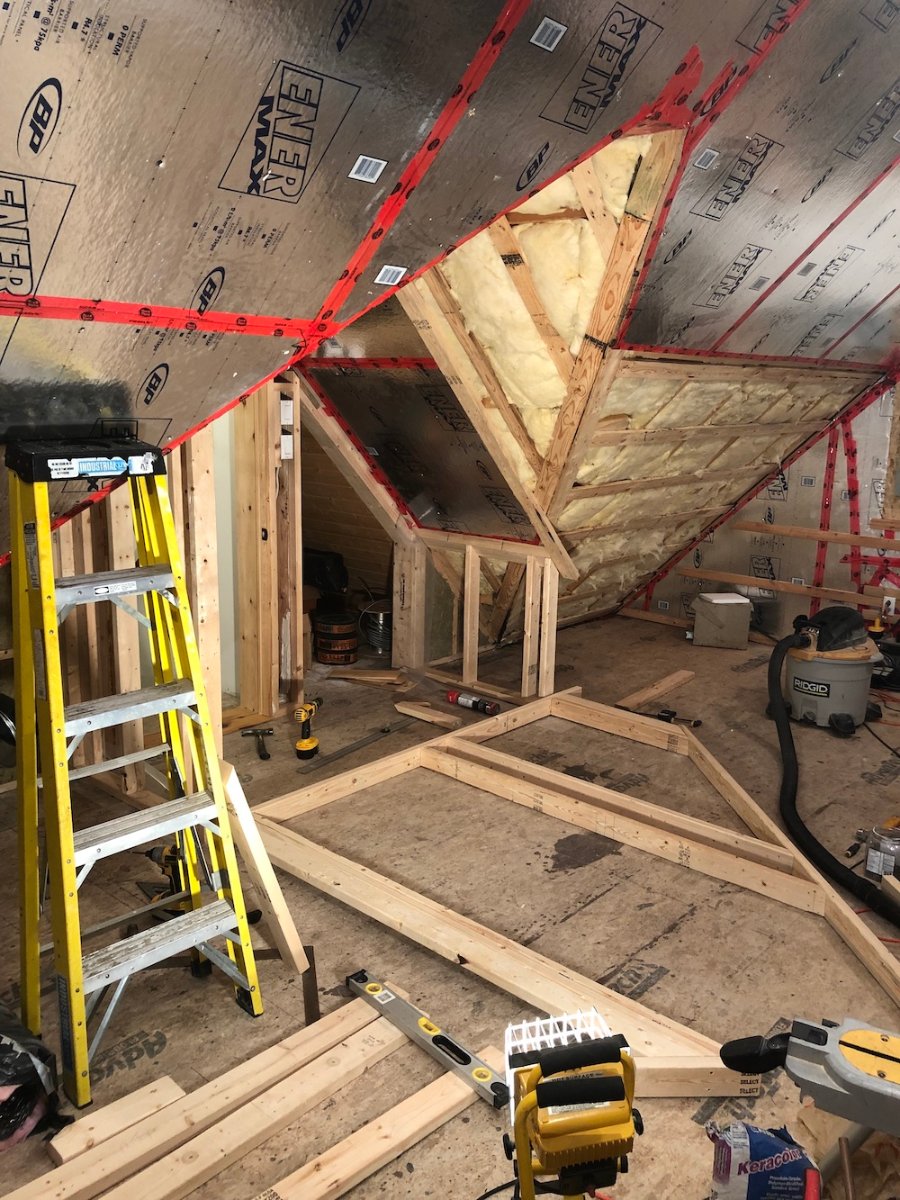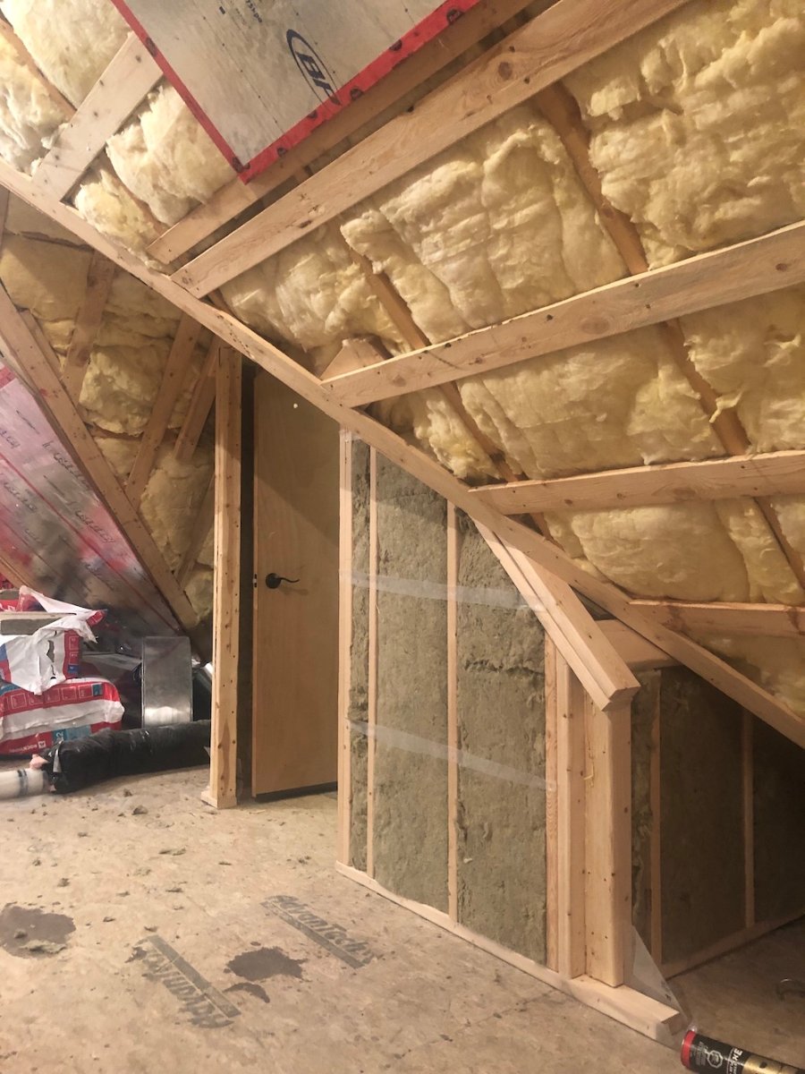 The new build required me to undo basically everything I had previously done. You can see the pictures I've included where I've taken down all the wall framing and I've started taking off all the 1x3 strapping, the Enermax panels used as my vapour barrier and the other 1x3 strapping under it. I'm literally stripping the entire room with the exception of the yellow fiberglass insulation. I will be reusing all of the Enermax in the basement when we decide to finish it.