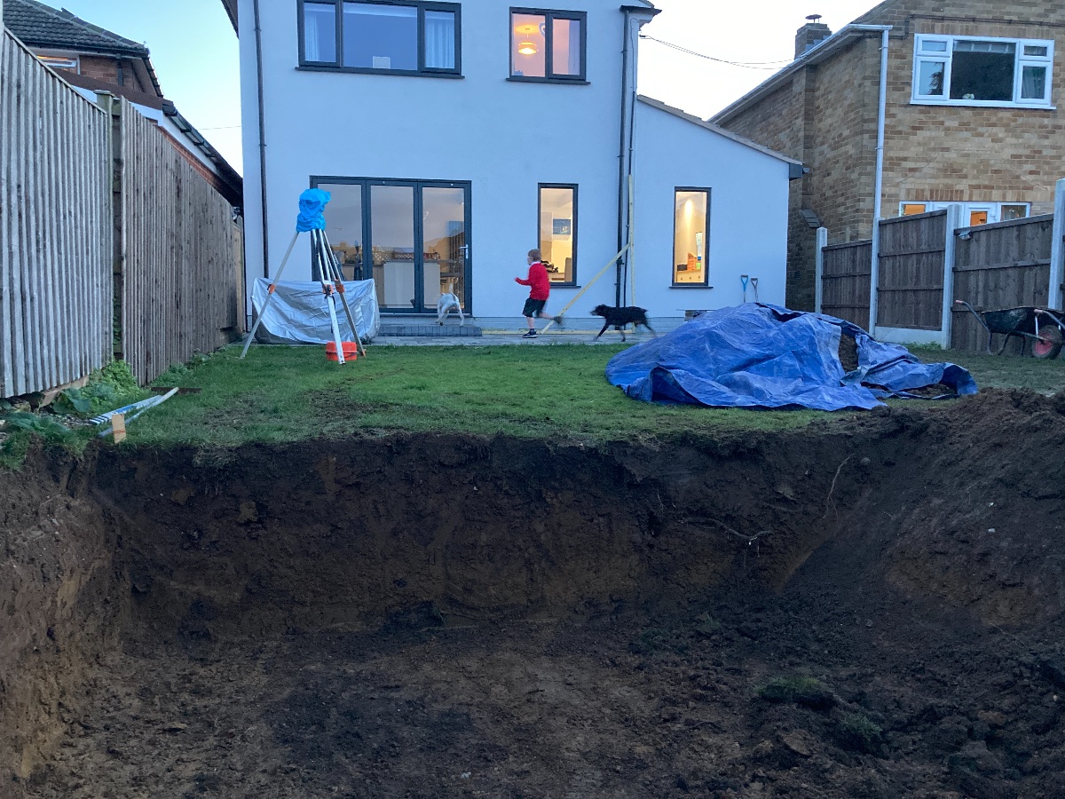 Day 1, the groundworks started with a mini digger digging the 80cm or so of ground out for my foundation - a single concrete slab. The floor level of the studio will be 350mm below ground hence the need to dig this deep. As you can see from the end day picture below, the guys managed to dig nearly 2/3 out. One grabber lorry of 22 tonnes has already been taken and there's still a pile of soil on the drive. Glad it wasn't me spending the day barrowing...
