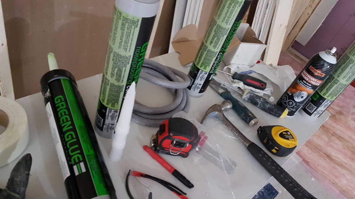 Silencer box. Best effort here with what I have to work with. It's only on the inner leaf (decoupled from the joists).