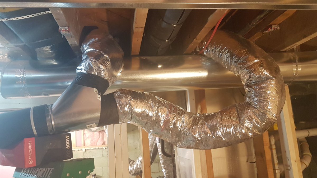 Working on HVAC ducting. The Y is to tie in a feed from the HRV. Main house HVAC provides heat (if needed) and A/C. Motorized dampers can close off the house HVAC pipes, so only the dedicated HRV is active