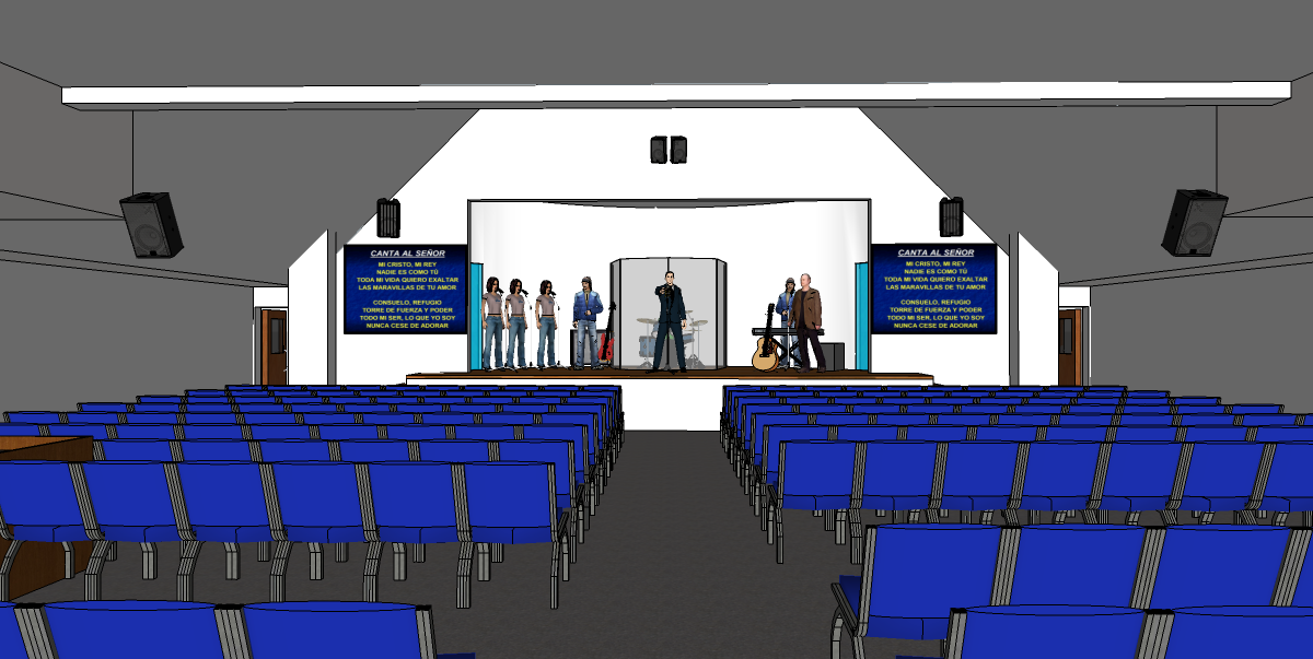 I was looking for somthing else earlier today, and accidentally came across a video animation I did for this church at one point. I did several such videos, as I normally do for a design process, but this specific one is from where I was working on the speaker layout and dispersion. That's what the colored cones are that appear and disappear at various points: I was checking that I was getting good coverage of all the seats. The speaker setup was a little convoluted, since its an LCR layout plus a pair of fill speakers under the rear balcony, with various delays and EQ issues, in addition to the coverage patterns, so I did this video to help visualize that. But you can also see the tiny, curved stage here, that the architect came up with. Very tight for the praise and worship band, and terrible acoustically. Note the panels I did for the curved wall there, to make the stage usable for them. We had a different layout for the stage at this point in the process: that changed later, as you can see in the photos above. You can also see the strange shape of the fall that I had to deal with (acoustic nightmare), and the reflective glass on the rear wall, above the balcony. Acoustic chaos. Architects!!!!