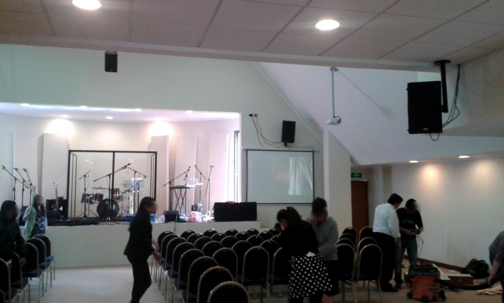 And below is a view of the not-quite-complete hall on inauguration day... They didn't quite make it to get the place finished for that day (hence the hanging cables, prototype panels, wrong drum booth, etc....). After that service was over, they pulled everything out again, and we re-did it properly, for the following Sunday.
