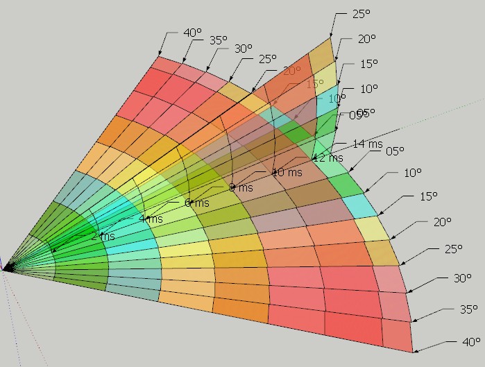 3. It is really slow! There's thousands of things it has to calculate in order to draw all of those slices, lines, angles, color, and numbers. It can take many seconds to update, after you click on the "Apply" button. While it is updating, you will see the word "Working" followed by a series of green bars advancing across the bottom of the main SketchUp window, as it does it's calculations. I did my best to make it fast, but it is not fast. The more options you select, the slower it will be. If you select a 90° spread in both directions, with 1° rays, that are many meters long, plus time circles every millisecond, colors on everything and numbers too, then you might as well go make a cup of coffee, 'cause it's gonna take a while! It might even crash SketchUp (or start World War 3), so make sure you save your model before you try: With different names. In different places. The reason it is so slow is because of the silly way SketchUp has implemented dynamic components. Dynamic Components is a very useful and powerful thing, but very quirky, and very basic. Things that would be easy to do in other programming languages are very complicated in SketchUp Dynamic Components. There's no global attributes, for example, so I had to manually copy every single attribute that I need, to every single part of the component. There's also no way to display a number based on data: for example, the angle numbers you see there are not calculated, like you'd think, because that doesn't work. You can't just tell it "Put the number of the angle you just made on a dimensions arrow". Nope. Doesn't have any way of doing that. So in this tool, for each ray angle, there are actually number dimensions for every possible angle that might occur there (all 45 of them, in each of four directions, on every single ray...)! All of which I had to create manually, typing each individual number, and then I had to write code to select which one to display depending on the angle, while hiding all the others. So there's hundreds more dimensions in there than are needed: you just can't see them. You only see the one that makes sense. That's also why you only get angle markers every 5°, not ever single degree. because otherwise there would be thousands more, and I'm not prepared to do that... It's also why you only get 20ms of timing circles, and nothing less than 1 ms increments (it would be nice to have .5ms increments too, and maybe even .1 ms... but it ain't gonna happen here).