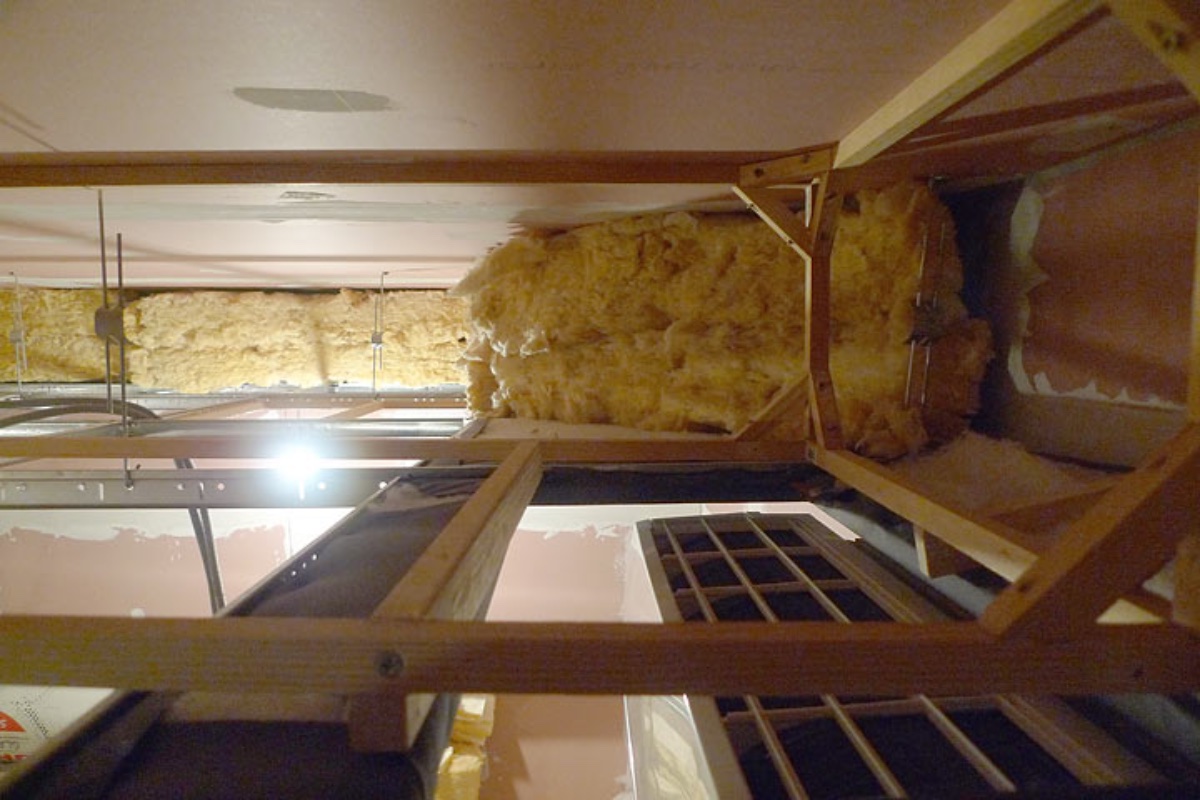 All the space between the plasterboard ceiling and the drop ceiling will be filled with insulation where there is not already a duct, silencer box or something else.