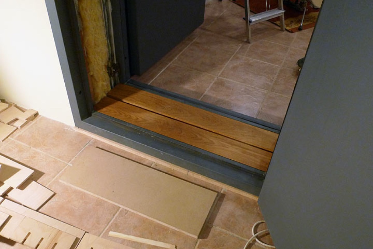 I have prepared a pair oak doorsteps to be the floor between the doors; practical but also maintaining the integrity of non-touching walls with a gap between them.