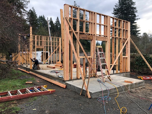 After the tarp was removed, it rained pretty good. Water in the building hasn't been a concern with the builders, but I decided to use my shop vac and suck up as much as possible. It worked great. I got it pretty dry and then we had a number of rain free days and some sun and things dried up pretty good. No more pooling of water. The process of shop vacuuming also helped me connect to the space. It is raining today (12/29/19), then dry for a couple of days and then more rain. Hopefully they will get the roof on before too much rain falls.