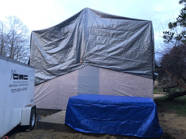 Prior to the change order drama, the general contractor and I agreed that the Builder's plan of tarping and building from the bottom up was not ideal. Water had been leaking in and if we got some heavy weather we wondered how well the tarp would hold up. So he was directed to pull the tarp and start working on the ceiling joists and roof and work his way down. To his credit, the builder made improvements to the tarping and the morning before he pulled the tarp it was quite dry in there and held up well over the previous night's rain.