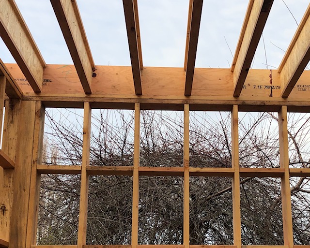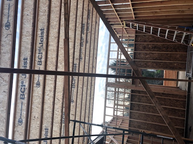 So his plan is to work that space starting on the ends and moving towards the center, lifting first a sheet of OSB through the joists and nail or screw (he didn't specify) down and then the green glue and drywall on top, one sheet at a time. Once the first few sheets were assembled at the ends, he would slide the needed drywall on top of the completed ones. Then slide up the OSB, adhere, then gg, then drywall from the ones already placed in the space. He would continue working his way towards the center. Once he has his final piece, he would cut an access door so the builder could get out and then he would plug, and seal this door. Seems like a lot more work than building everything on the floor as a module and lifting up. But what do I know? I will continue to ask about this. Since we are building from roof down now, we have some time to talk about it. The sentiment was that it will be cheaper and quicker to do their plan.