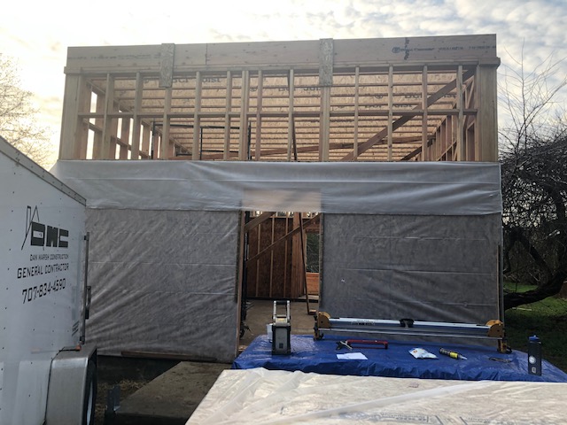So I am preparing a response to his change order. Basically I will pay for anything not specified on the approved plan, but not if it is. It gets tricky with this whole tarping part. While there is no mention of tarping on the plan, he discussed it with his builder. It makes sense to keep the OSB dry for the green glue, but am I responsible for the methods they use to accomplish the different aspects of the actual construction as drawn on the approve plan? Isn't that his responsibility to figure that out prior to bidding? I want to be reasonable and not stick it to him because I know he is trying to cover himself from taking a bath on this project. But I am also not made of money and I still have to pay for the HVAC, silencer boxes, and any treatments I want to do inside.