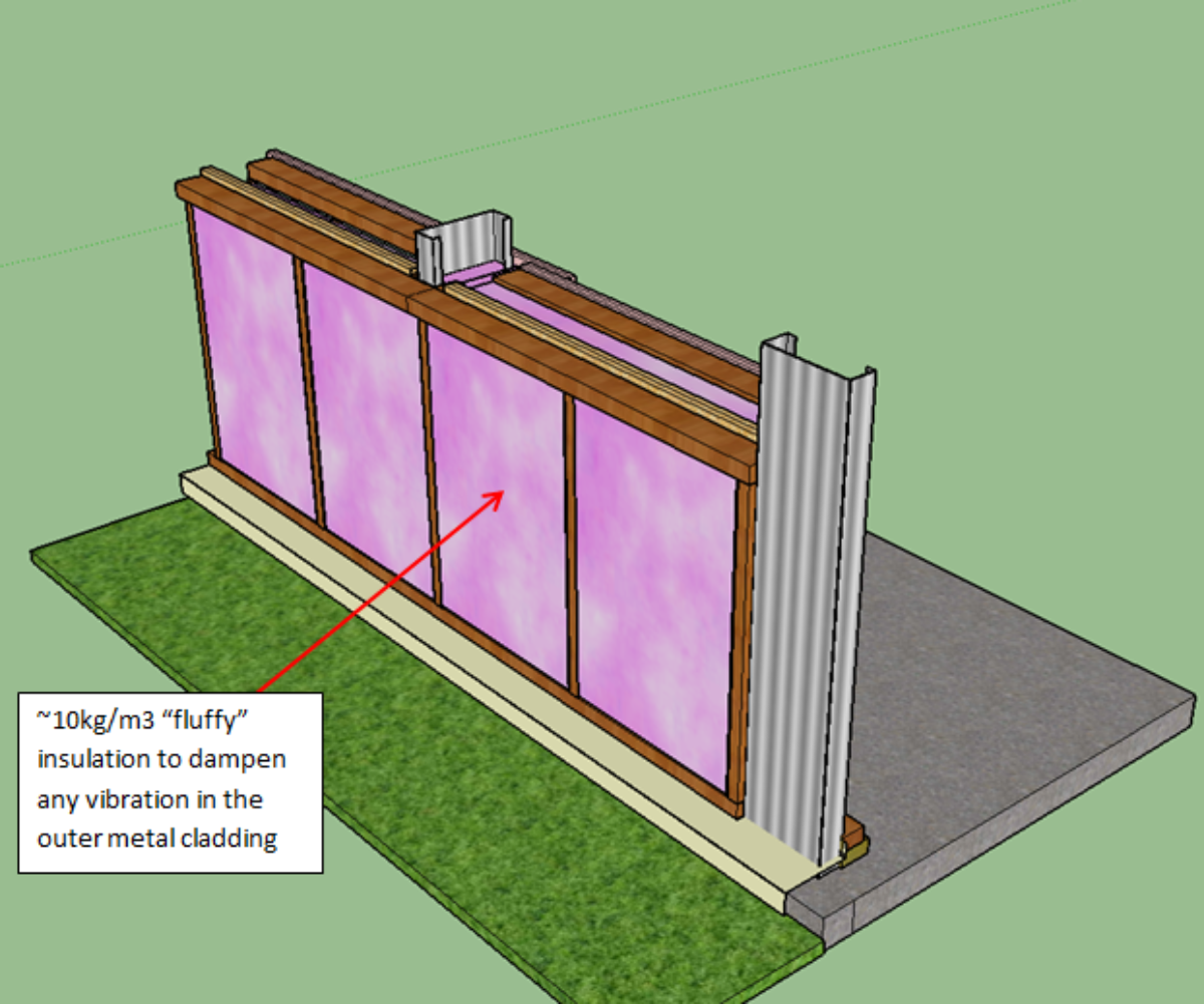 4. The insulation I’m using behind the metal sheet cladding has a lower GFR than I was proposing in earlier posts – I’d stuffed up the price comparison so the Bradford Soundscreen I was looking at will have to wait until its broadband absorption time.