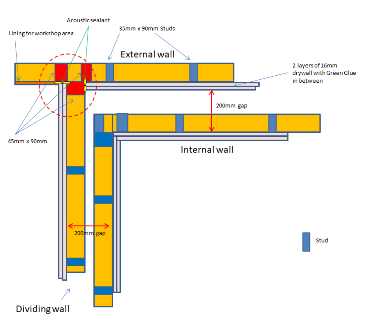 My outer room wall structure is a mix of "normal" and "inside out". It is normal where the outer wall is part of the external structure but I want the internal wall that divides my studio from my workshop to be inside out - simply because it maximises use of space. That makes for an slightly unusual corner structure where the normal meets the inside out. I'm just wanting to get some input on my approach to the join.