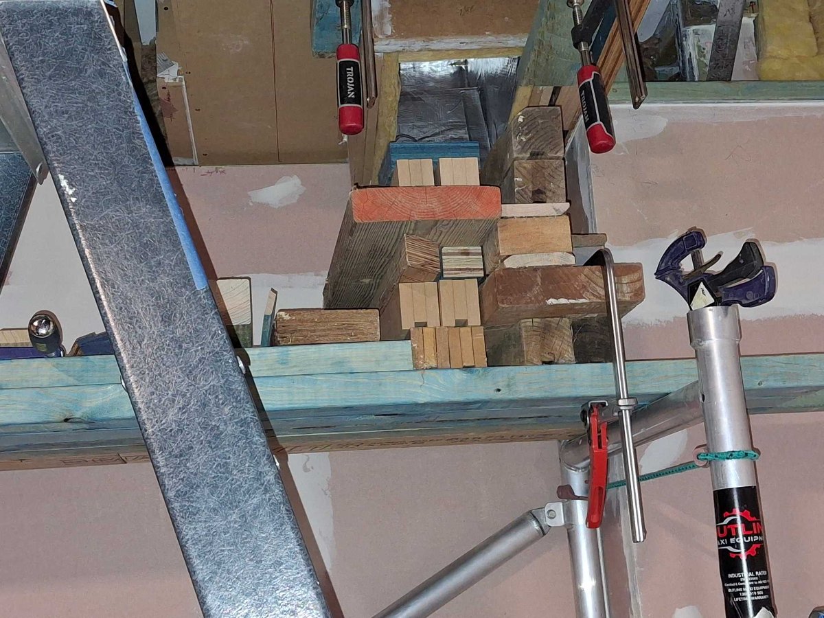 It’s not a disaster but could have been; disaster avoided because, after some discussion, the support for the C section is able to run along the line of the rake under the joists – bolted through to the wall frame. I really didn’t want vertical studs inside the room and continuing the horizontal framing under the joists the whole way around helps me with fixing the fabric cover under the joists/insulation anyway.