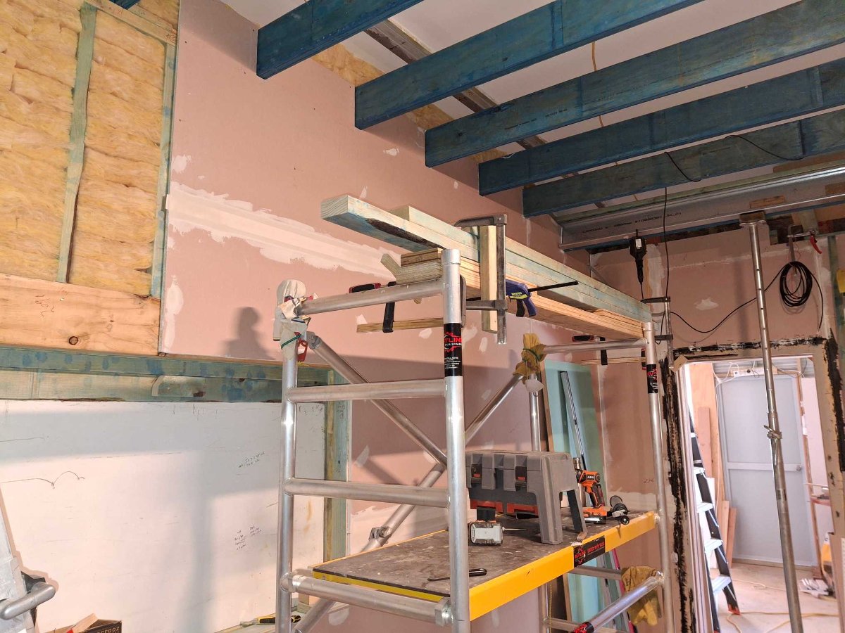I needed to bolt a C section steel purlin to the first timber joists at both ends of the room to increase the load bearing capacity. However, the steel purlin needed to be supported directly by the wall frame and I had progressed the frame and sheeting too far at this point to get the steel purlins to land on the existing wall frame. His solution was to add a vertical supporting stud inside the room under the steel purlin at either end and bolt that stud through the wall sheeting to the frame.