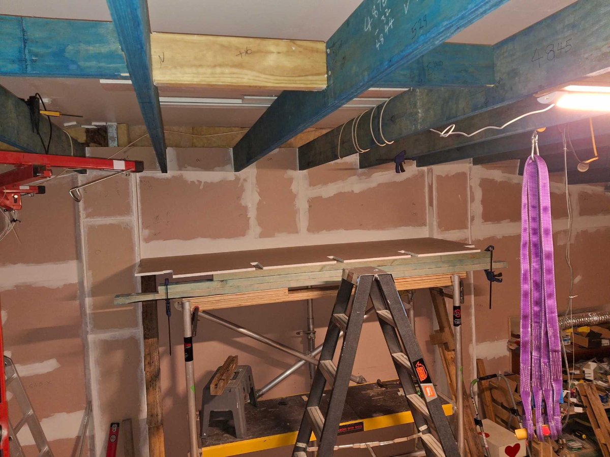 The drywall lift and acrow props got the job done (with a few straps for safety) :D