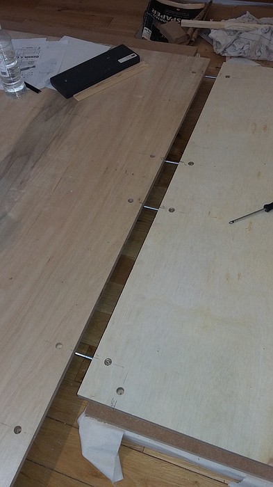 They are joined by the cam lock bolts commonly found on flat pack furniture. I've left a gap for a 9mm edge trim on each riser;