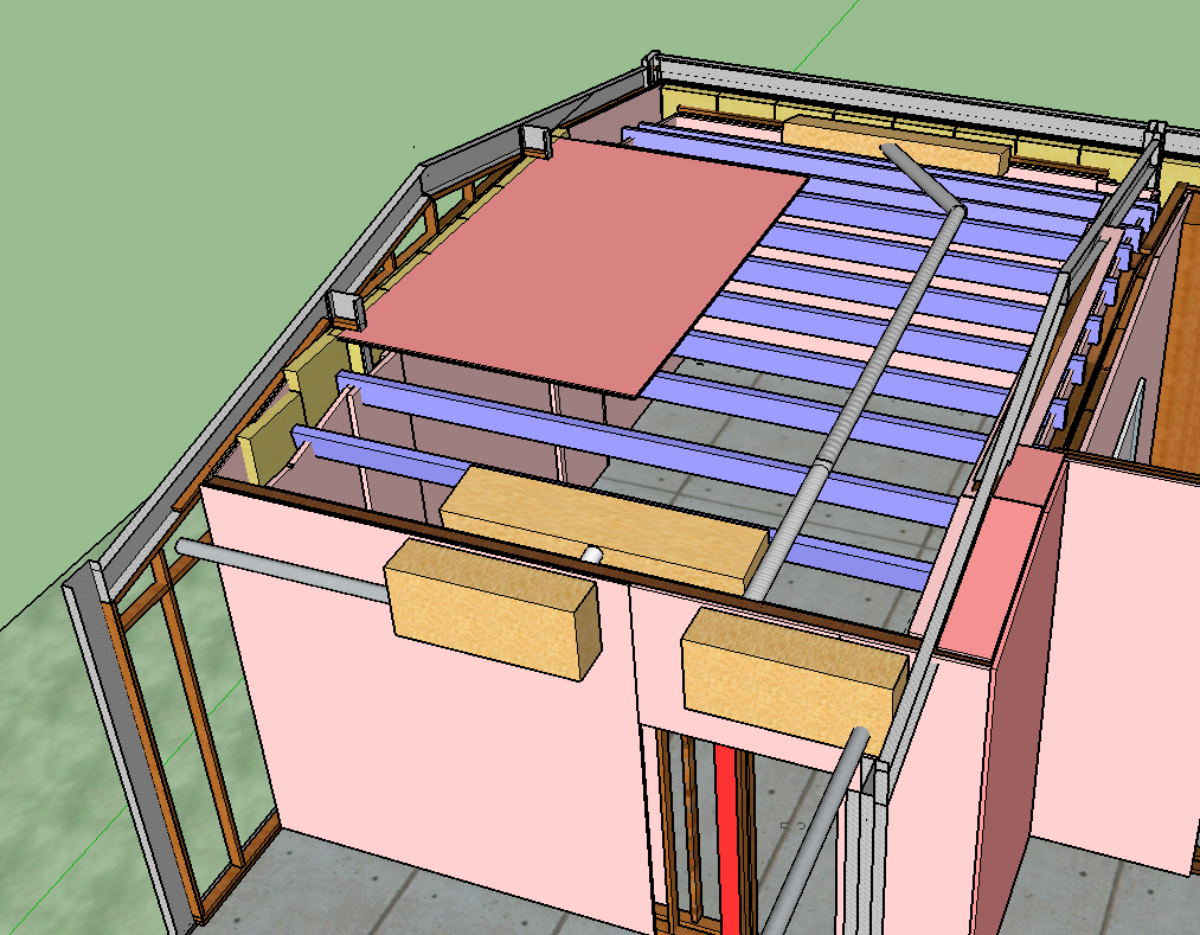 Here is the “big picture” plan. (Ignore the half-finished door spaces in the model. Also, there’s obviously tons of fluffy in the ceiling gap but I’ve left that out for clarity.)