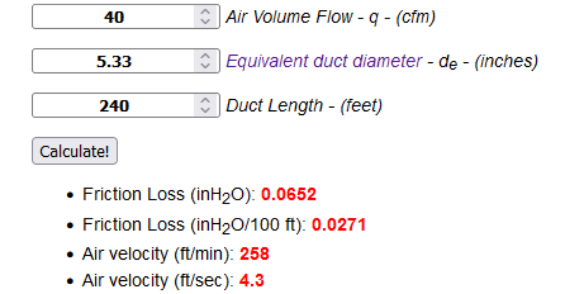 Adding the static pressure from 40 feet of 5” duct across the internal and external runs (0.0544 wg) and allowing 0.1 .wg for louvres/filters gives me a total static pressure of 0.357 + 0.0544 + 0.1 = 0.36 .wg = 89 Pa