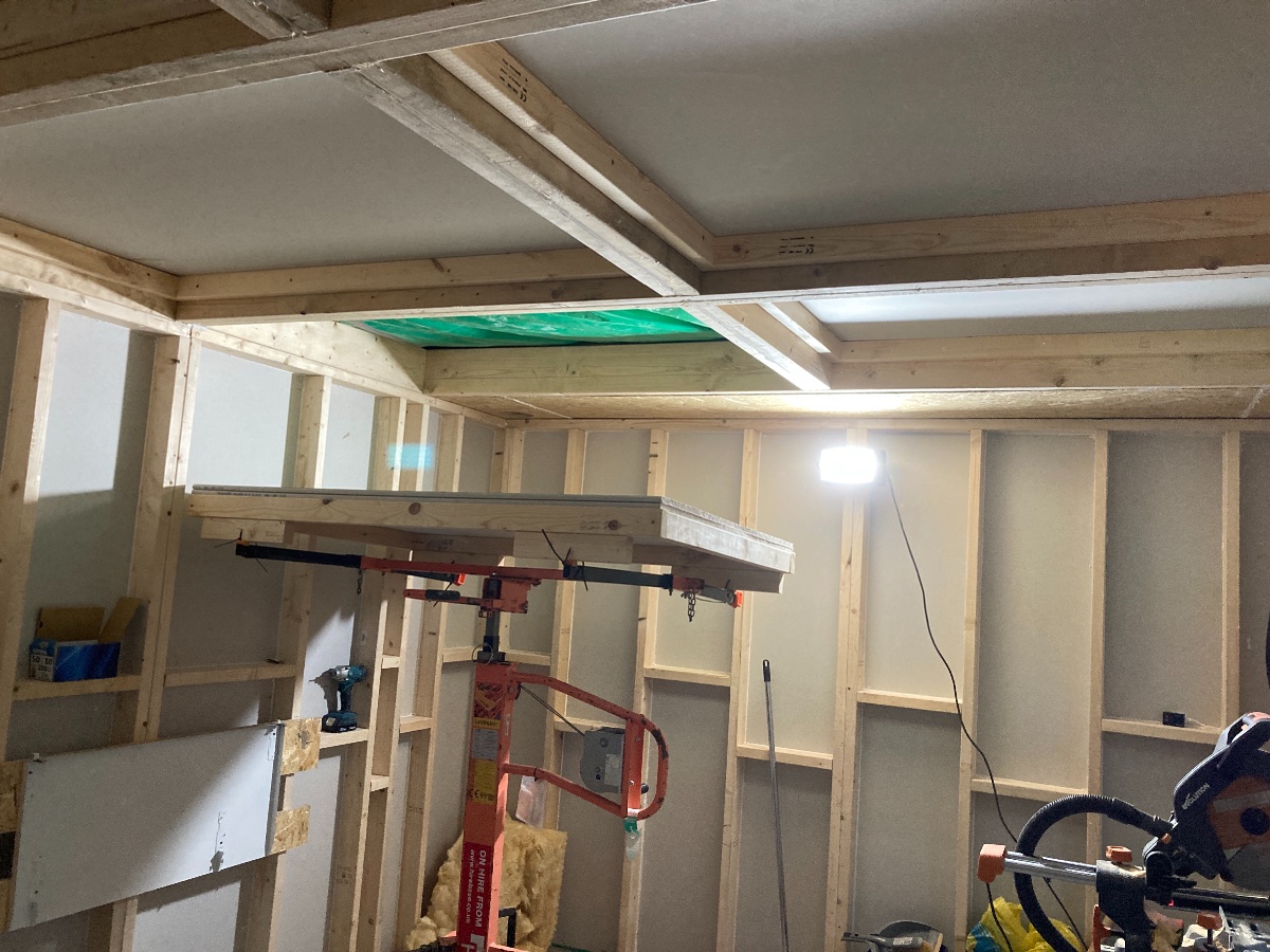 Anyway, the plasterboard lift is a godsend and with a bit of bodging I used it to lift all 8 ceiling modules. As I was working alone these were actually assembled on the lift - I made the frame from 3x2, attached it to the lift, did a test lift to make sure it fit, then added the two layers of plasterboard whilst the frame was on the lift, then lifted into situ.