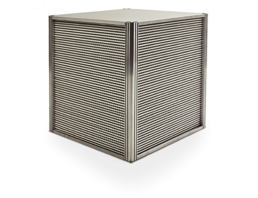 You can see the two air flow streams crossed over, going through alternate layers of thin corrugated metal.