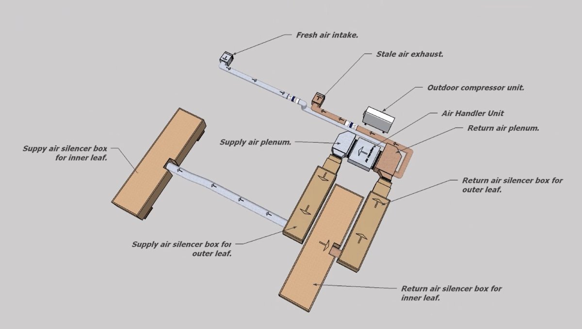But there's a big problem actually implementing this in practice: Studios have acoustic isolation walls around them! And we need to chop huge holes in those walls to get the ducts in! That's a problem, because even small holes will trash your isolation. That's where "silencer boxes" come in.