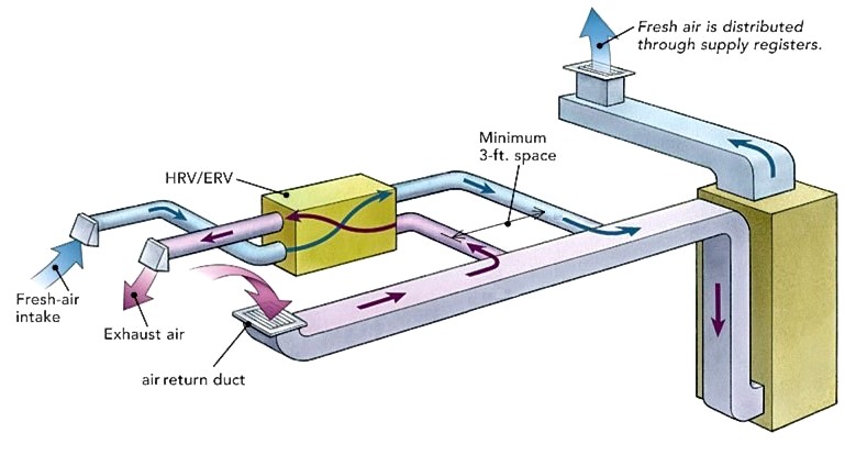 3) An HRV or ERV transfers heat (and humidity) between the fresh-air stream and the stale-air stream.