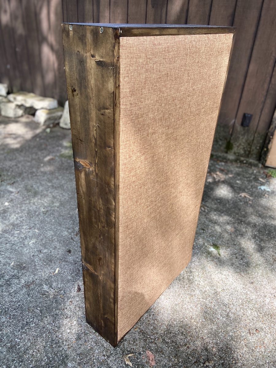 I also HIGHLY recommend the faux burlap fabric from bestfabricstore.com (it’s breathable, but has a nice clean/tight weave compared to regular burlap, and it’s made of polyester so it’s very smooth to the touch...there are a ton of different colors too and they all have a nice Heathered look to them). AND the polyester batting material behind this. I used the 4oz variety I believe and got a giant roll from Joanns online for about $60. The fabric itself is not very see through but I think without the poly bat material, the fabric frame would show through the front a bit. Plus it gives it a very slightly “poofy/soft” look on the front edges making it appear as more expensive upholstery. We were very happy we had this stuff.