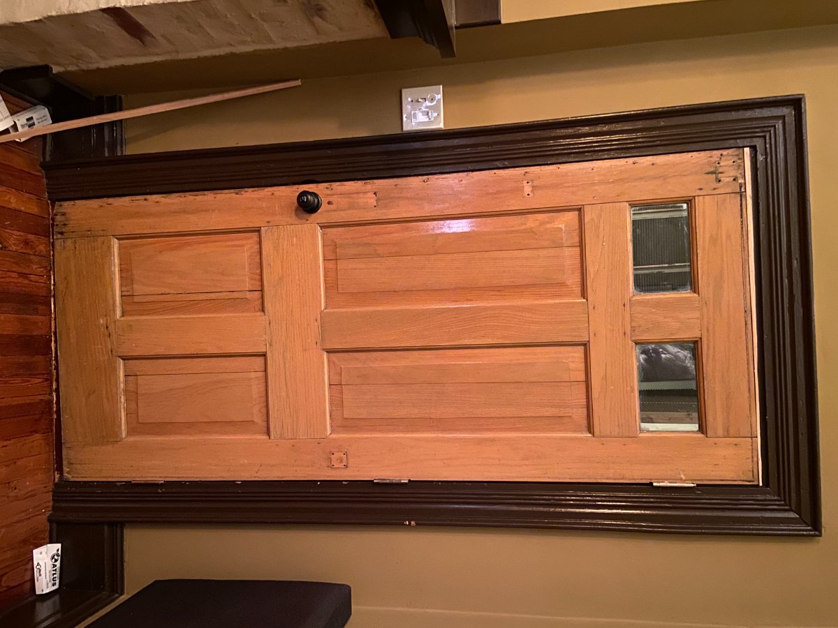 - A door has been installed! It's the $50 door I got on craigslist. The thing weighs a ton and is apparently solid oak according to the guy who hung it (no I was not up for the challenge... :shock: )