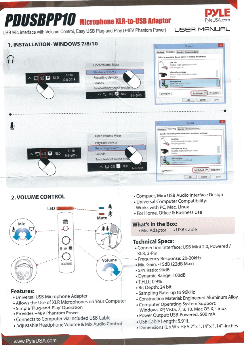 Thanks Stuart. You're right. I realized after I posted that it was not correct. I tried my original settings on another computer and I got the same results as the one I first posted. So I think it is the Pyle soundcard. So I will pick a Steinberg UR24c digital audio interface from our local music store tomorrow and try again. It is the only brand they have. I will return the PYLE XLR to USB adaptor to Amazon.