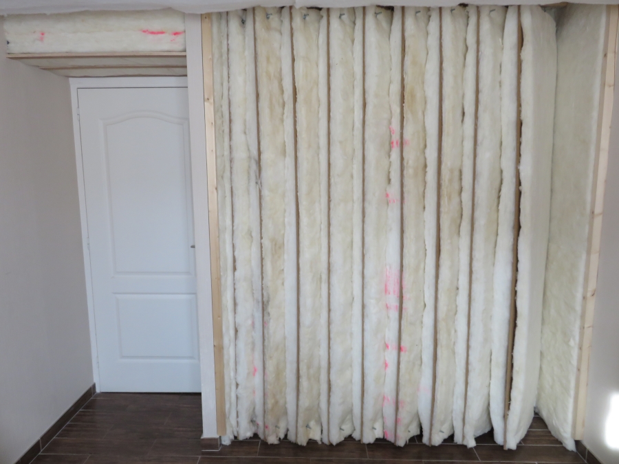 As you can see, I made 60cm deep hangers panels on the back wall (thank you Stuart for helping with that ;) ), 60cm deep superchunk bass trap above the door, and I have filled the ceiling with 20cm deep glasswool with a density of 17kg/m3 and an air flow resistivity of 7kPa.s/m². I have covered it with polyester batt in order to avoid fibers from falling of the ceiling.