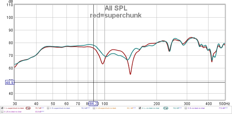 Next, I took some left over glasswool and cut it to do a rough and quick superchunk in the left front corner of the room and then measured the left speaker to see what effect it would have on the low end. As you can see the 2 dips are much clearer and much deeper with higher Q, but between the two there is an improvement.