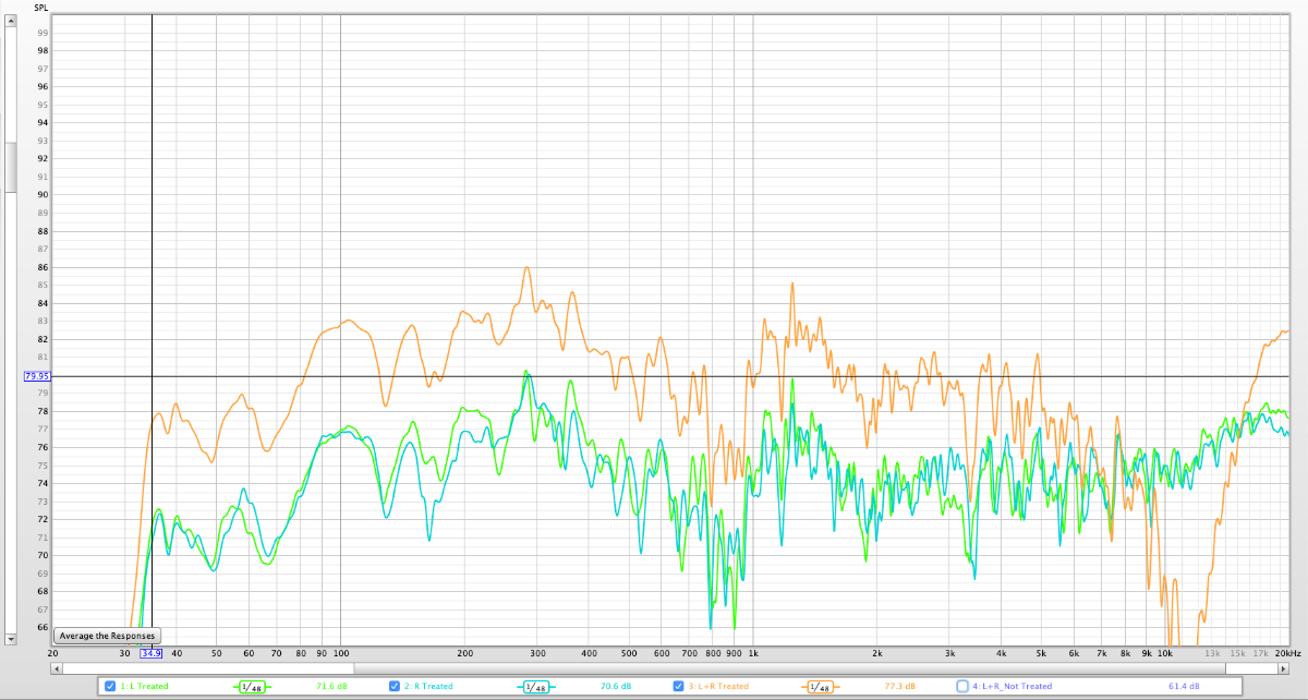 As you can see in the REW measurements there is an substantial improvement compared to the non treated room where everything is more smoothed out. From 20hz to 500hz there are still dips here and there but only 3db difference from 80db excluding 300hz area. Huge dip at 800hz and massive dip at 10-12khz, The room definitely sounds much better now compared to prior of treatment, the low end is much tighter, I’ve also noticed a very strong resonance in the high freq when I’m inside the room I assume it is the untreated ceilings.