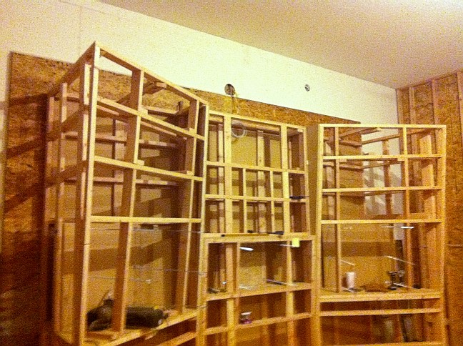 ... Except that the actual walls of that room are NOT angled! In fact, the room is rectangular, and the surfaces you see there were built inside the room. Here's a view of some of the framing behind that front section. You can clearly see the rectangular shell of the room, and the shaping for the speaker supports and reflecting panels.