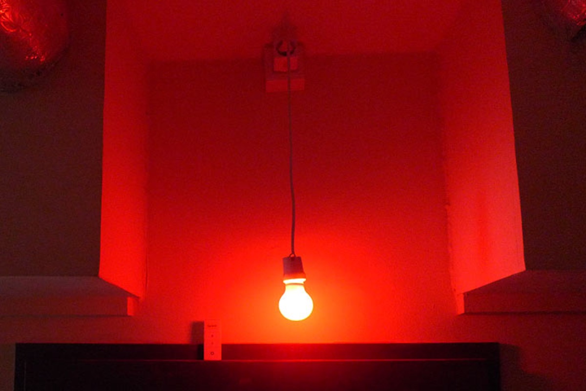 On the wall is an externally mounted socket, into which is plugged a Philips Hue Smart Plug, into which I plugged the short cable and a normal (non-Philips Hue) red bulb. The Smart Plug enables the Philips system to switch the power to the bulb on and off.