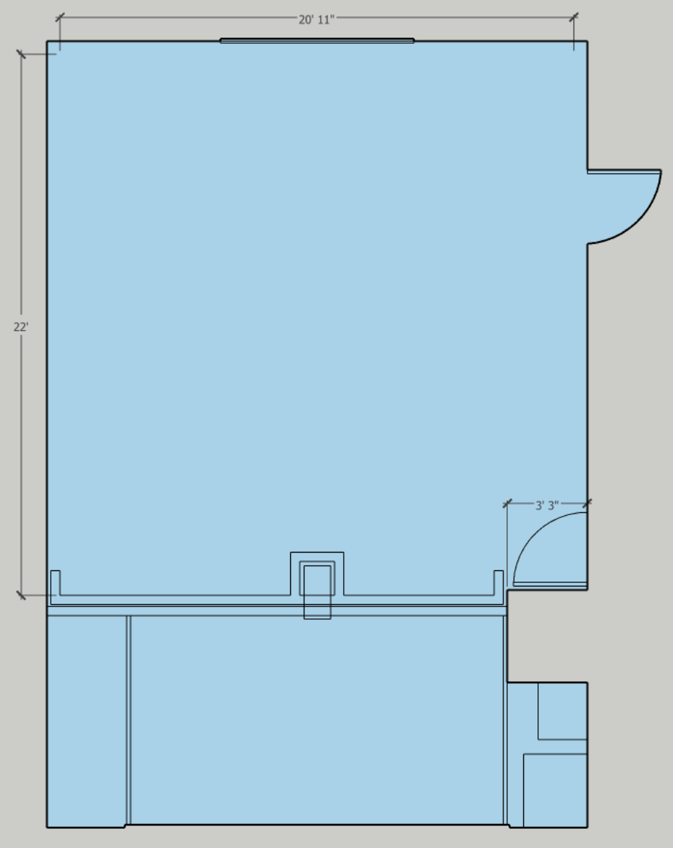 What's mapped here is the usable space, and the plan is to split it into part workshop part recording studio. We'd like to keep the garage door and opener in tact for easy workshop access from our driveway. Everything is on concrete slab and ceilings are currently about 9ft high. Electric and lights are already run on 3-4 separate breakers, but we'll likely hire an electrician install a sub-panel when we get to it.