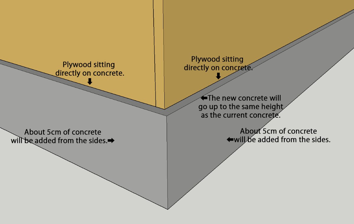 Right now there’s a layer of structural plywood install right above the concrete footing as you can see in the picture on post #60 of this thread. They say that they’ll cover up the plywood so that the new concrete won’t get on the plywood surface. My concern is: Wouldn’t the moisture from the new concrete seep through the existing concrete into the plywood and damage them? Or should I be ok?