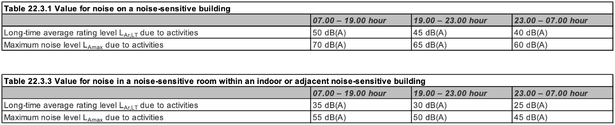 That means that if I commit to the maximum values in table 22.3.1 Value for noise on a noise-sensitive building, and apply the 10 dB ‘music penalty’ and apply this on my property line, I might have a ‘reasonable’ legal framework for determining the maximum allowed sound values in case there will be future discussion/problems concerning sound disturbance.