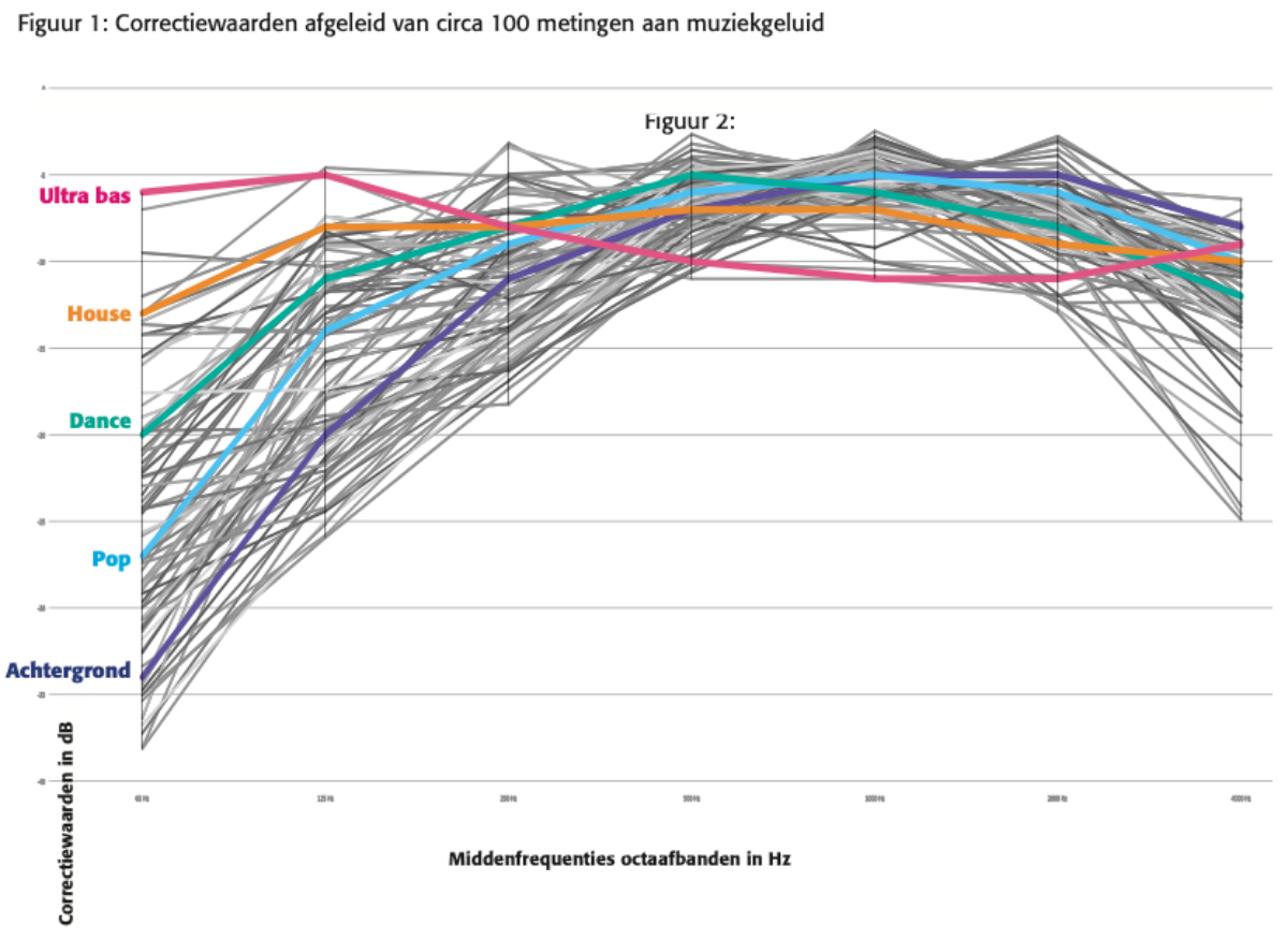Since the studio is going to be very close (1,5m) to my property line, I'm going to assume for a moment that I won't get a lot of help/reduction as a result of geometric expansion of the sound. So the outside of the studio has to measure LAr,NT<30dB(A). Now my thoughts would be that I have to have split up the LAr,NT<30dB(A) into separate octave bands that will ultimately sum back to LAr,NT<30dB(A). Some frequencies will have more energy than others, and the dominating frequencies should be isolated more in order to end up LAr,NT<30dB(A). I found a few correction or reference curves that might help splitting up the 30dB(A) into separate octave bands. The following image comes from "NSG - Richtlijn muziekspectra in horecabedrijven" (translation: NSG - Guideline for music spectrums in catering establishments/nightclubs). (LINK: https://nsg.nl/file/CE34_LY/) The table is in Dutch but I think the words used here look a lot like the English equivalents, if there is any trouble I'm happy to translate.