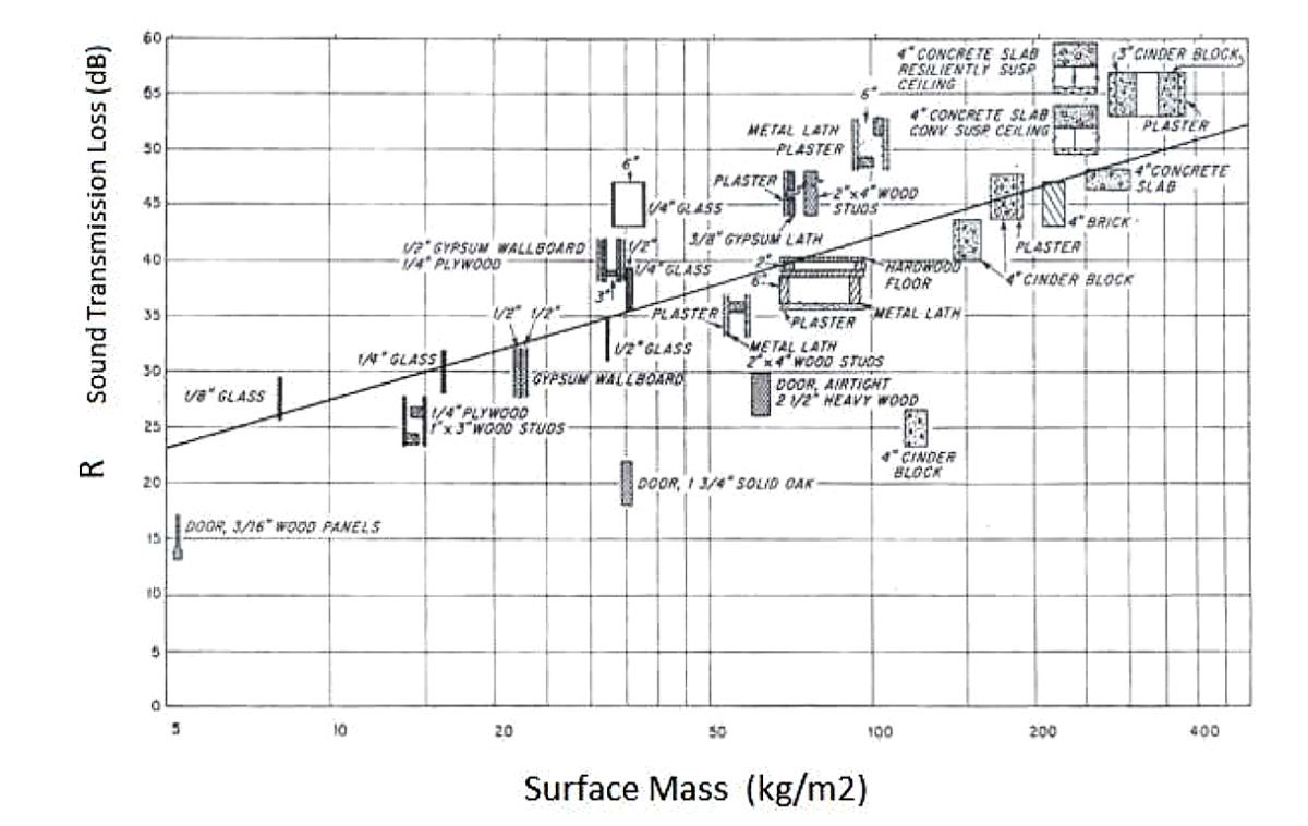Here's a graph that makes it even simpler: That comes from the famous Marshall Day Acoustics paper on isolation, in the section about single-leaf barriers.