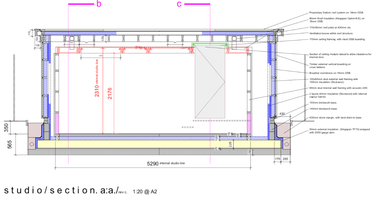 The whole building will be sunk into the ground so that the top of the concrete block is 350mm below ground level. This will give me enough head height whilst staying within the permitted development rules. The highest part of the building (the front) will be 2.4m about ground.