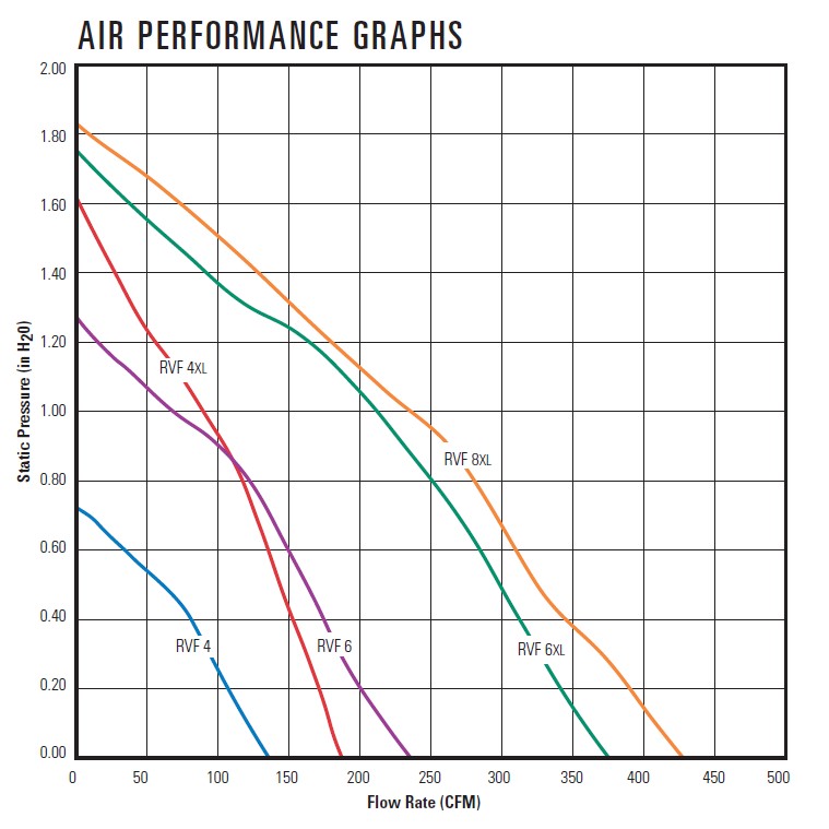 That shows several curves for several different fan models made by this manufacturer. The vertical scale shows the static pressure, and the horizontal scale is the air flow rate. So even though the "RVF6xl" model (green curve) has a nominal rating of 350 CFM, that only applies for very low static pressure, of 0.2 inches of water. If the static pressure in your system is actually 0.5, then this fan can only move 300 CFM. And if your static pressure is 0.8 inches of water, you would only get 250 CFM out of it. At 1", you are down to 200 CFM, or only 57% of the rated nominal rate. At 1.4 inches, all you get is 100 CFM of flow: less than 1/3 of the nominal rating. At 1.6", it is down to less than 50 CFM (14% of nominal). In fact, the maximum static pressure that this fan can handle, is 1.74 inches of water (according to the manual, but not shown on this graph): after that, all bets are off, and you are into the range of blade stall and motor damage. At that static pressure, it cannot move any air at all: 0 CFM. Even though the motor would be spinning away heatedly, and the fan blades rotating greatly, the air would not move, because the blades would be in a full aerodynamic stall. The only result would be a LOT of turbulence around the fan, with air whooshing around madly in all directions at random... but not going anywhere.