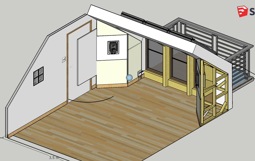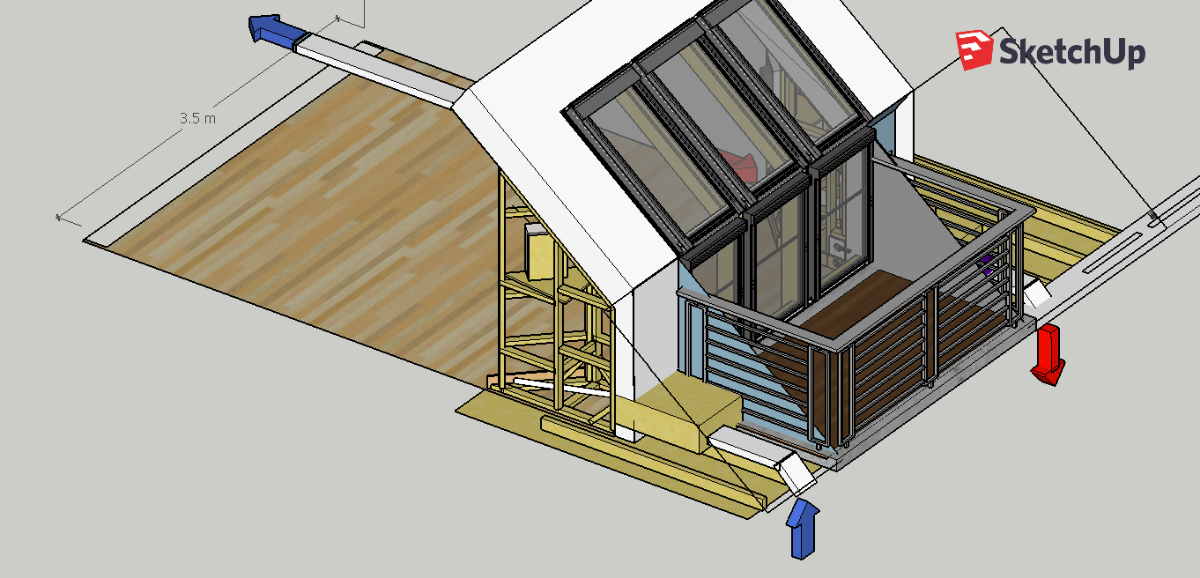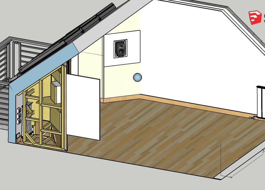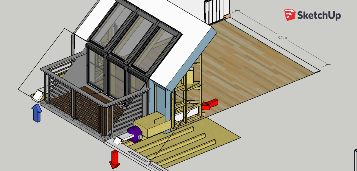 Here's the tentative rough design sketch. Very much at the idea stage - nothing to scale, no calculations done yet, and the duct routing needs work. The fan I'm thinking of is an inline centrifugal quiet type designed for mounting in loft spaces. I'm assuming oversized slow running ones can be used here, and floated on the rafters to prevent vibration transfer if required.