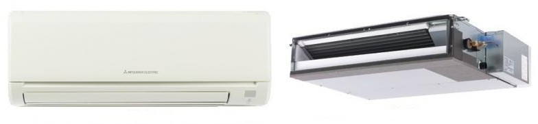 The one on the left is the ductless or non-ducted type (what you typically see on the wall im houses, shops, etc.), and the one on the right is the ducted type, often also called an AHU for "Air Handler Unit" (which would be mounted in the ceiling space or wall space, normally, or maybe in the attic or basement, connect to the ducts that go to the room(s) ). Both types are mini-split, and in both cases there's some type of compressor unit outside, such as one of these two types: