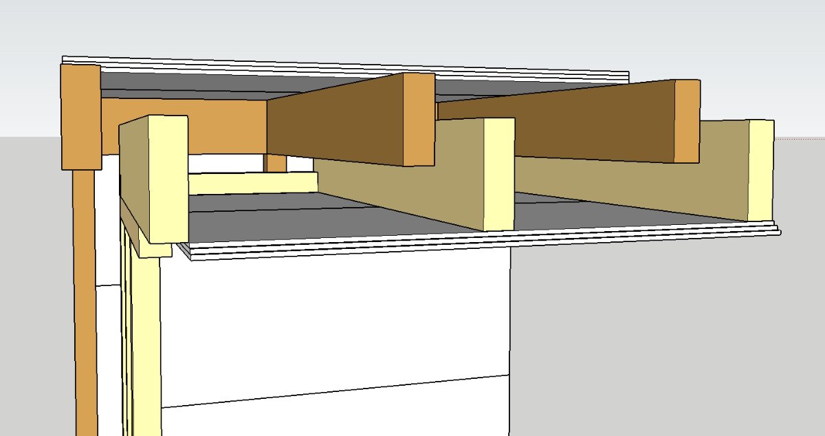 1st design is to have the ceiling joists of the inner shell attached “above” the wall framing instead of within it. I saw a guy on youtube do something like this where ceiling space was limited. As you can see in the images below (this one might be a little hard to see/understand) just the ceiling joists are sticking out above, these joists will fit in between the ceiling joists of the outer shell without touching them. Since the ceiling joists of the inner and outer shell would be kind of next to each other, the height of the building can be lower maybe by 40-50cm.